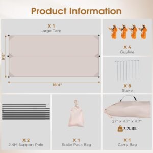 - 100% SATISFACTION: Package includes everything needed – 1 x Large Camping Tarp, 2 x Support Poles, 8 x Stakes, 4 x Guy Lines, 1 x Stake Pack Bag and 1 x Carrying Bag. Designed specifically for camping. Please rest assured to buy, and if you are not satisfied, you can contact us at any time. We will reply within 24 hours and provide you with a perfect solution