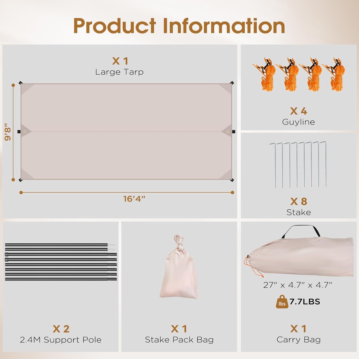 - WITH POLES AND PORTABLE: Camping tarp comes with 2 poles, of which the height can be adjusted from 25 to 90 in to satisfy your different needs. Tent tarp weighs 7.7 lbs and with a storage bag. The unfolded size of the tent tarp is 10 x 16.4 ft, packaging size is 27 x 4.7 x 4.7 in. You can get different shapes of shade by adjusting the height and the position of the poles tied with the tarp