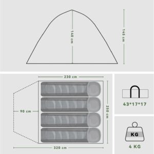 - Camping tent: Expanding size: 320*250*145cm (bedroom: 230*250*145cm), storage size: 43*17*17cm. Product weight: 4KG Large space, small package, easy to carry.
