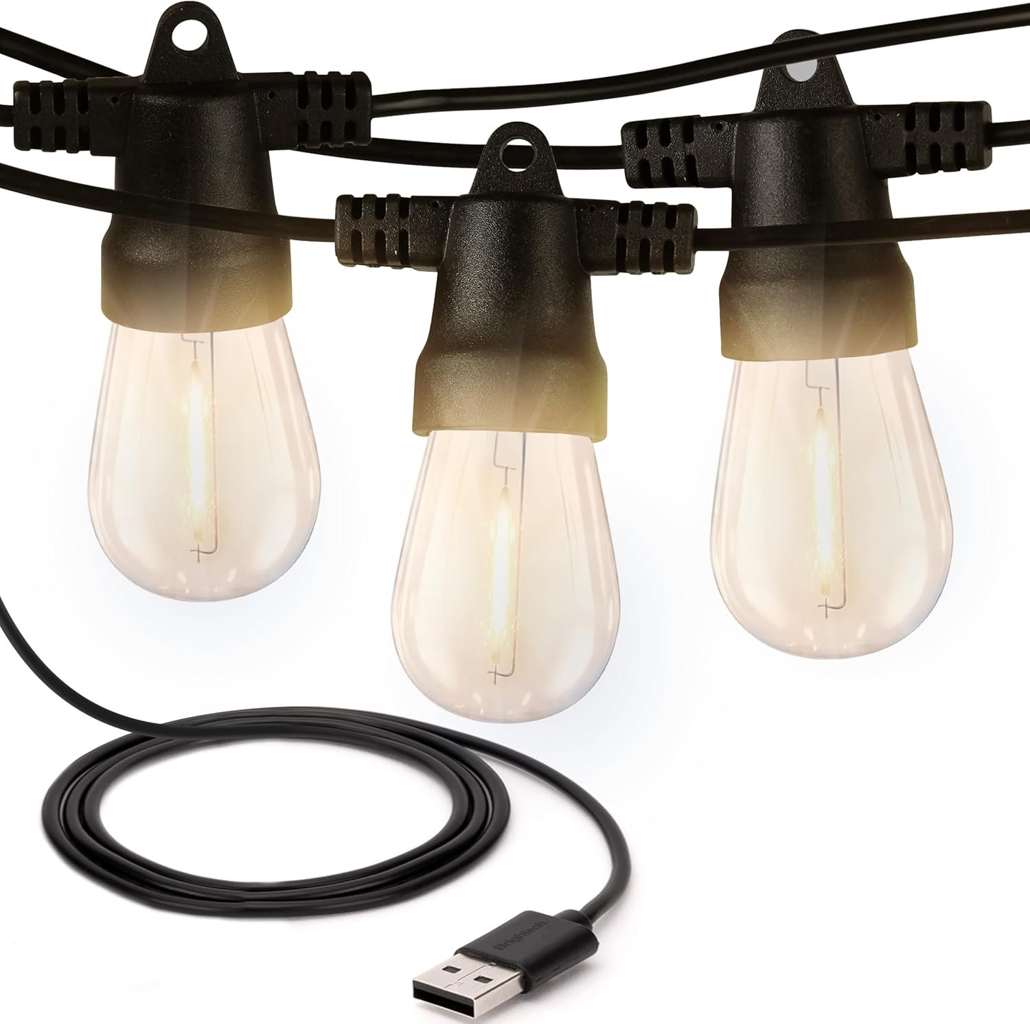 - USB LED String Lights: Use a standard power pack for charging phones and plug in our string lights. Don’t need to worry about power off even it’s cloudy, rainy, or at night. 24.5 ft long durable LED outdoor string lights have 10 heavy-duty shatterproof bulbs. The lighted portion is 17 feet.